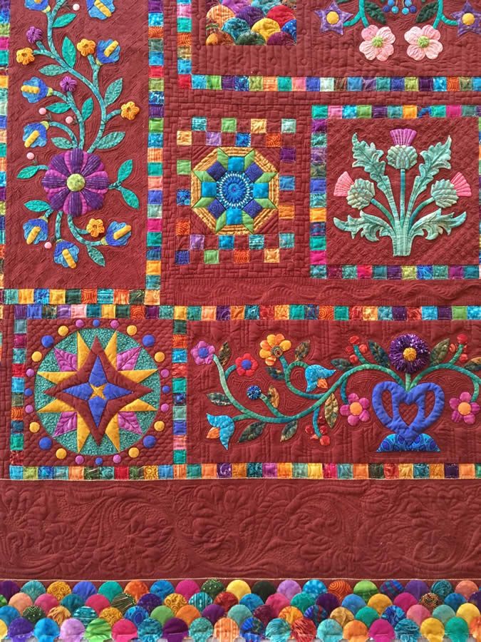 Techniques: Hand appliqué, machine appliqué, machine pieced, domestic machine quilted, hand beaded.